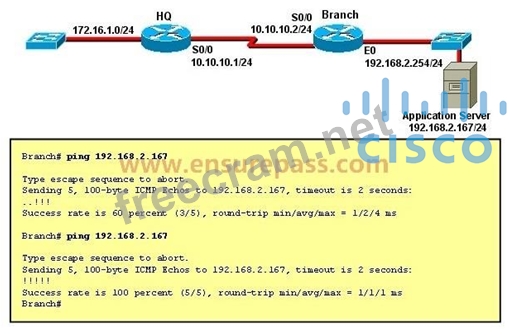 Refer to the exhibit. The network administrator is testing connectivity from the branch router to the newly installed application server. What is the most likely reason for the first ping having a success rate of only
