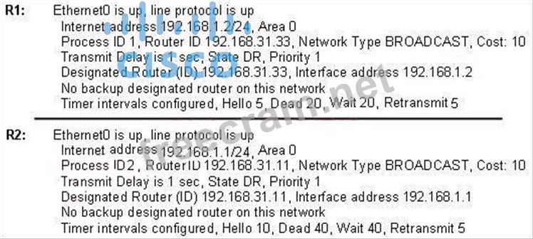 A network administrator is troubleshooting the OSPF configuration of routers R1 and R2. The routers cannot establish an adjacency relationship on their common Ethernet link.