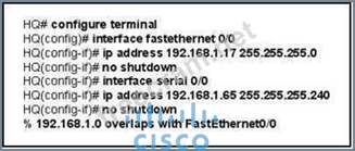 Refer to the exhibit. After configuring two interfaces on the HQ router, the network administrator notices an error message. What must be done to fix this error?