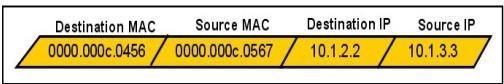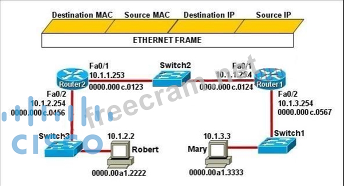Mary is sending an instant message to Robert. The message will be broken into a series of packets that will traverse all network devices. What addresses will populate these packets as they are forwarded from Router1 to Router2?