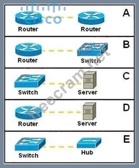 Refer to the exhibits labeled A through E All devices are to be connected over Ethernet. Which three device-to-device configurations are likely to require the use of a crossover connection? (Choose three.)