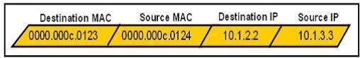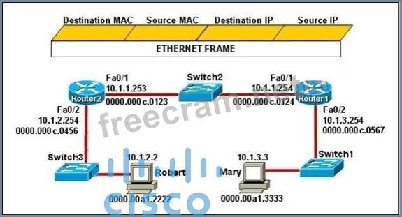 Mary is sending an instant message to Robert. The message will be broken into a series of packets that will traverse all network devices. What addresses will populate these packets as they are forwarded from Router1 to Router2?