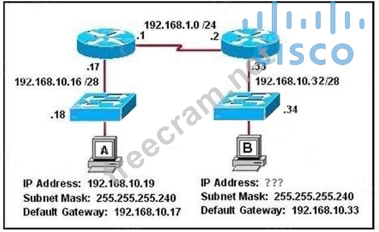 Refer to the exhibit. Host B has just been added to the network and must acquire an IP address. Which two addresses are possible addresses that will allow host B to communicate with other devices in the network? (Choose two.)