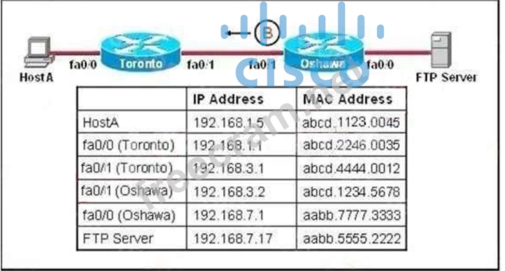 Refer to the exhibit. HostB is sending a file to HostA. B represents the frame as it leaves the Oshawa router. What is the Layer 2 destination address of the frame at this point?