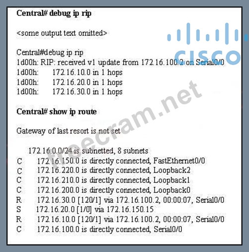 172.16.20.0, and 172.16.30.0 are accessed through the Central router's serial 0/0 interface. No users are able to access 172.16.20.0. After reviewing the command output shown in the graphic, what is the most likely cause of the problem?