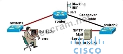 Refer to the exhibit. Pierre has just installed the mail server and Switch2. For security reasons UDP packets are not permitted outbound on the Fa0/1 router interface. Pierre is now at his workstation testing the new installation and is not able to establish SMTP communication to the mail server.