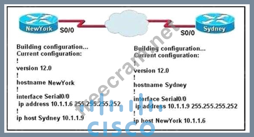 Refer to the topology and partial configurations shown in the exhibit. The network administrator has finished configuring the NewYork and Sydney routers and issues the command ping Sydney from the NewYork router. The ping fails. What command or set of commands should the network administrator issue to correct this problem?