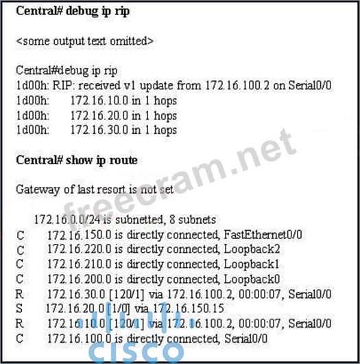 172.16.20.0, and 172.16.30.0 are accessed through the Central router's serial 0/0 interface. No users are able to access 172.16.20.0. After reviewing the command output shown in the graphic, what is the most likely cause of the problem?