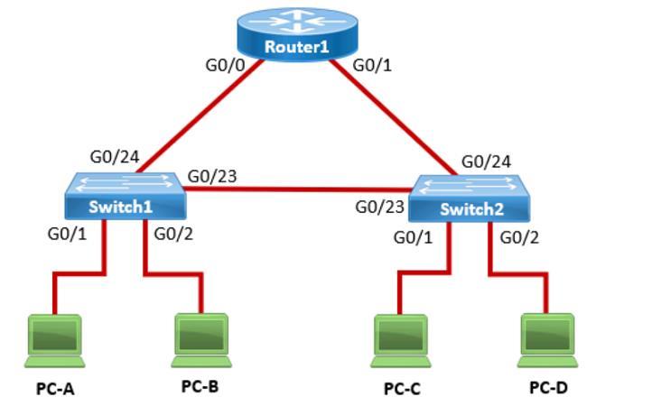 Understanding How Layer 2 Switches Handle Unknown MAC Addresses Switches operate at Layer 2 (Data Link Layer) of the OSI model and maintain a MAC address table (CAM table) to forward frames efficiently. * When a switch receives a frame, it checks its MAC address table to see if it knows the destination MAC address. * If the destination MAC address is not in the table (meaning the switch does not know which port leads to PC-C), the switch follows the flooding behavior. What Happens When Switch1 Receives a Frame from PC-A to PC-C? * Switch1 checks its MAC table: * The source MAC (PC-A) is recorded in the table on port G0/1. * The destination MAC (PC-C) is not in the table. * Switch1 does not know where PC-C is: * It floods the frame out of all active ports except the port it was received on (G0/1). * This means the frame is sent to: * Switch2 (via G0/23) * PC-B (via G0/2) * Switch2 receives the frame and follows the same process: * If Switch2 has PC-C's MAC in its table, it forwards the frame appropriately. * If not, it floods the frame again until PC-C replies. * Once PC-C responds, Switch1 and Switch2 learn its MAC address and update their tables. Why Other Options Are Incorrect: # A. Switch1 queries Switch2 for the MAC address of PC-C. * Incorrect: Switches do not query other switches directly for MAC addresses. Instead, they rely on learning MAC addresses dynamically through frame forwarding. # B. Switch1 drops the frame and sends an error message back to PC-A. * Incorrect: Switches do not drop frames for unknown MAC addresses. Instead, they flood the frames out all ports except the incoming port. # D. Switch1 sends an ARP request to obtain the MAC address of PC-C. * Incorrect: * ARP (Address Resolution Protocol) is only used to resolve IP addresses to MAC addresses. * Since PC-A is sending a frame (Layer 2), not an IP packet (Layer 3), ARP is not involved here. Conclusion Since Switch1 does not know the destination MAC address, it floods the frame out all active ports except the port it was received on. This is the default behavior of Layer 2 switches when they encounter an unknown MAC address. Thus, the correct answer is:# C. Switch1 floods the frame out all active ports except port G0/1. References * Cisco CCNA 200-301 Official Guide - MAC Address Table & Frame Forwarding * RFC 894 - Standard for Ethernet Frame Forwarding * Cisco Networking Essentials - Switch Flooding Behavior