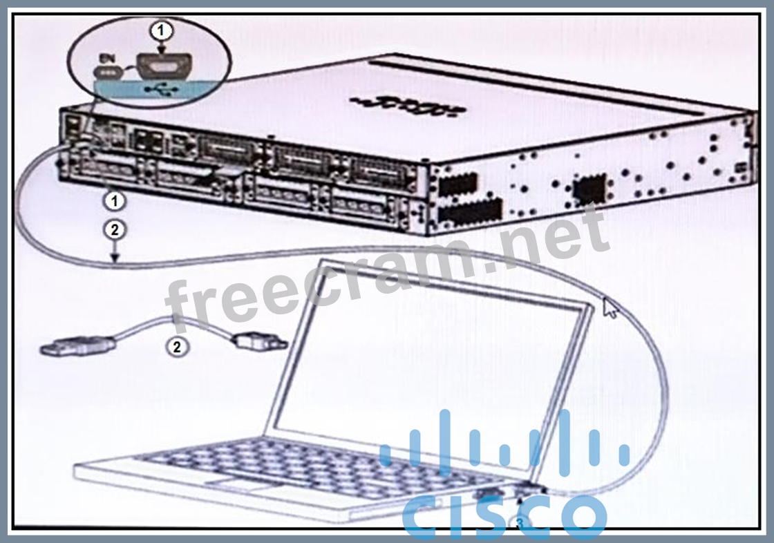 The image provided shows a networking device connected to a laptop via a console cable. Based on the visual indicators and standard port designs: C . 3 is a USB 5-pin mini USB Type B port: The port labeled "3" on the laptop is smaller than a standard USB Type A port, which suggests it is a mini USB Type B port, commonly used for connecting to networking devices for console access. E . 2 is a USB 5-pin mini USB Type B to USB Type A console cable: The cable labeled "2" has one end that fits into the mini USB Type B port on the laptop (as identified in point 1), and the other end, which is not clearly visible in the image, is inferred to be a USB Type A connector that would typically connect to a computer's USB port.