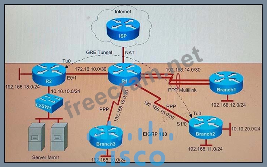 The GRE tunnel is configured between R2 and Branch2 routers, and traffic between Server farm1