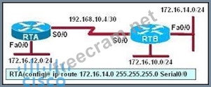 RTA is configured with a basic configuration. The link between the two routers is operational and no routing protocols are configured on either router. The line shown in the exhibit is then added to router RTA.