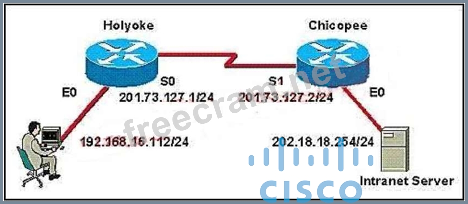 Refer to the graphic. Users on the Holyoke router are unable to access the intranet server attached to interface E0 of the Chicopee router. Inspection of the routing table of the Holyoke router shows that an entry for the Chicopee E0 network is missing. Which command will configure the Holyoke router with a path to the intranet server network?
