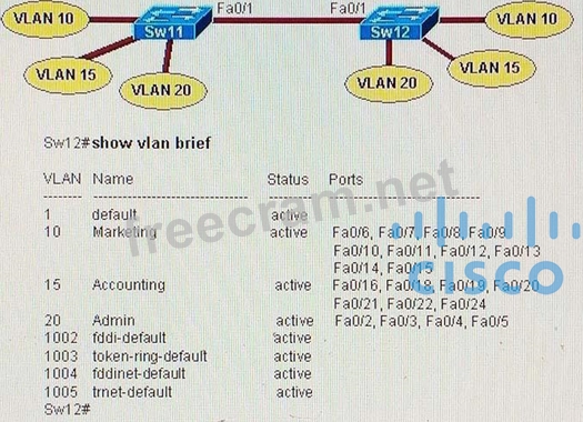 Refer to the exhibit. A technician has configured the FastEthernet0/1 interface on Sw11 as an access link in VLAN 1. Based on the output from the show vlan brief command issued on Sw12, what will be the result of making this change on Sw11?