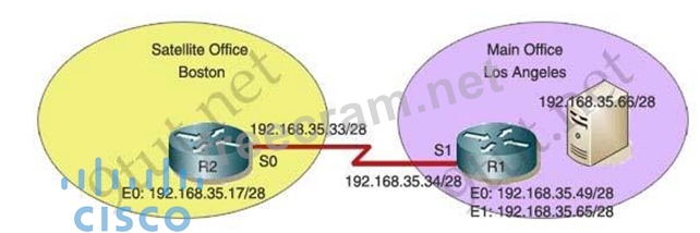 You work as a network technician at 9tut. Study the exhibit carefully. The company has a main office in Los Angeles and a satellite office in Boston. The offices are connected through two Cisco routers. The Boston satellite office is connected through the R2 router s0 interface to the Los Angeles office R1 router s1 interface. R1 has two local area networks. Boston users receive Internet access through the R1 router.