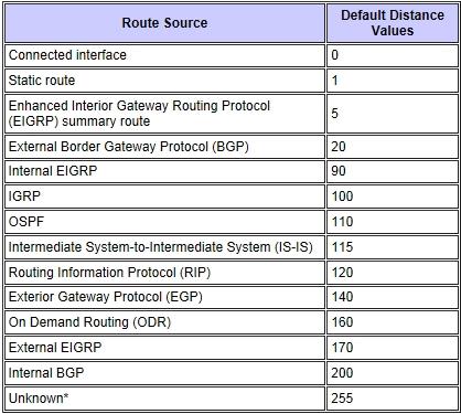 Note: The smaller the administrative distance value, the more reliable the protocol. For example, if a router receives a route to a certain network from both Open Shortest Path First (OSPF) (default administrative distance - 110) and Interior Gateway Routing Protocol (IGRP) (default administrative distance - 100), the router chooses IGRP because IGRP is more reliable. This means the router adds the IGRP version of the route to the routing table.