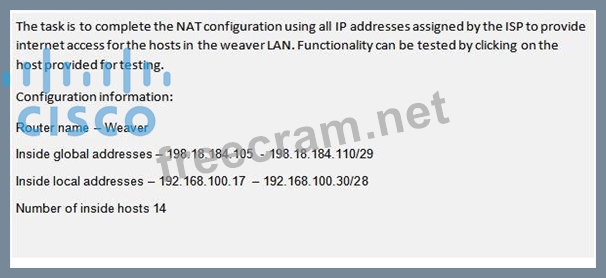 14 hosts that need to access the internet simultaneously. The hosts in the company LAN have been assigned private space addresses in the range of 192.168.100.17 - 192.168.100.30.