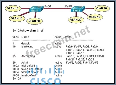 A technician has configured the FastEthernet 0/1 interface on Sw11 as an access link in VLAN 1. Based on the output from the show vlan brief command issued on Sw12, what will be the result of making this change on Sw11?