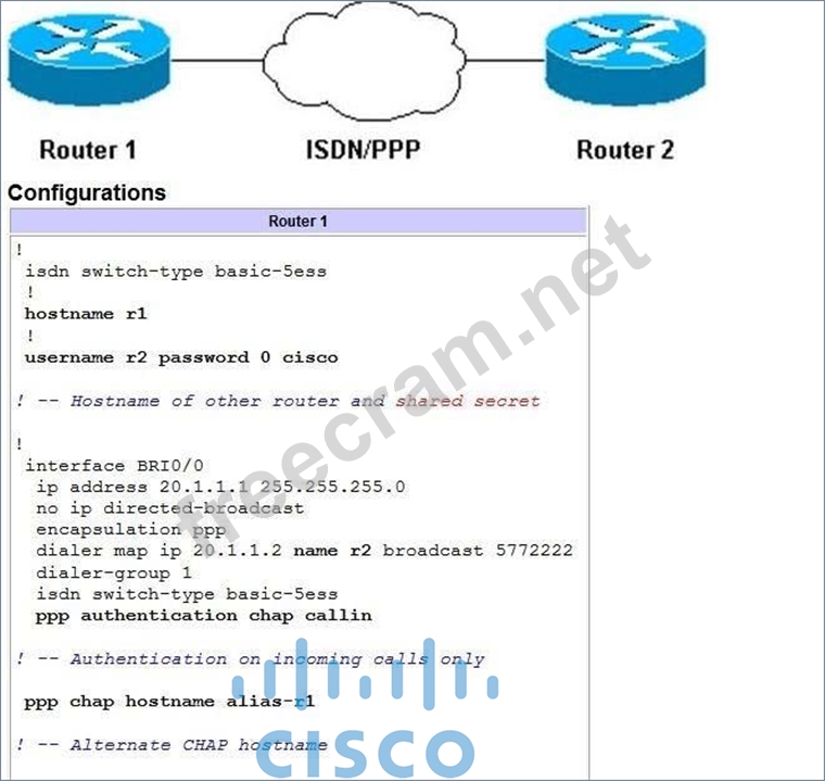 If Router 1 initiates a call to Router 2, Router 2 would challenge Router 1, but Router 1 would not challenge Router 2. This occurs because the ppp authentication chap callin command is configured on Router 1. This is an example of a unidirectional authentication. In this setup, the ppp chap hostname alias-r1 command is configured on Router 1. Router 1 uses "alias-r1" as its hostname for CHAP authentication instead of "r1." The Router 2 dialer map name should match Router 1's ppp chap hostname; otherwise, two B channels are established, one for each direction.