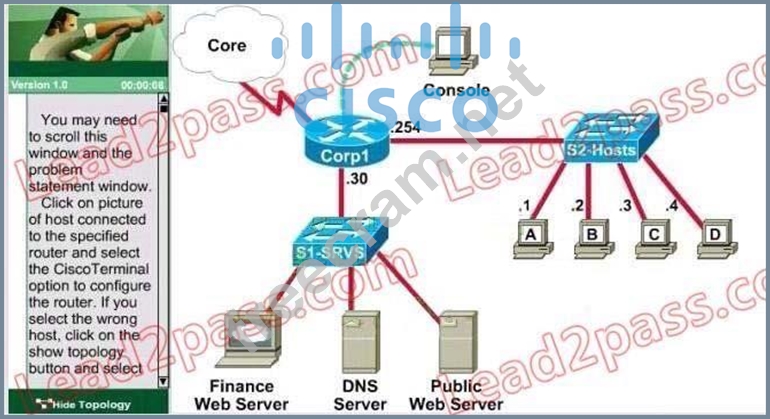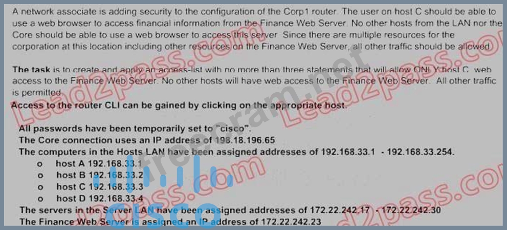 Corp1#configure terminal Corp1(config)#interface s1/0 Corp1(config-if)#ip add 198.18.196.65 255.255.255.252 Corp1(config-if)#end Corp1>enable Corp1#show running-config Corp1#configure terminal Corp1(config)#access-list 100 permit tcp host 192.168.33.3 host 172.22.242.23 eq 80 Corp1(config)#access-list 100 deny tcp any host 172.22.242.23 eq 80 Corp1(config)#access-list 100 permit ip any any Corp1(config)#interface fa0/1 Corp1(config-if)#ip access-group 100 out Corp1(config-if)#end Corp1#copy running-config startup-config Explanation : Select the console on Corp1 router Configuring ACL Corp1>enable Corp1#configure terminal Comment: To permit only Host C (192. 168. 33. 3){source addr} to access finance server address (172. 22.242. 23){destination addr} on port number 80 (web) Corp1(config)# access-list 100 permit tcp host 192.168.33.3 host 172.22.242.23 eq 80 Comment: To deny any source to access finance server address (172. 22. 242. 23) {destination addr} on port number 80 (web) Corp1(config)# access-list 100 deny tcp any host 172.22.242.23 eq 80 Comment: To permit ip protocol from any source to access any destination because of the implicit deny any any statement at the end of ACL. Corp1(config)# access-list 100 permit ip any any Applying the ACL on the Interface Comment: Check show ip interface brief command to identify the interface type and number by checking the IP address configured. Corp1(config)#interface fa 0/1 If the ip address configured already is incorrect as well as the subnet mask. this should be corrected in order ACL to work type this commands at interface mode : no ip address 192. x. x. x 255. x. x. x (removes incorrect configured ip address and subnet mask) Configure Correct IP Address and subnet mask : ip address 172. 22. 242. 30 255. 255. 255. 240 ( range of address specified going to server is given as 172. 22. 242. 17 172. 22. 242. 30 ) Comment: Place the ACL to check for packets going outside the interface towards the finance web server. Corp1(config-if)#ip access-group 100 out Corp1(config-if)#end Important: To save your running config to startup before exit. Corp1#copy running-config startup-config Verifying the Configuration : Step1: Show ip interface brief command identifies the interface on which to apply access list . Step2: Click on each host A,B,C & D . Host opens a web browser page , Select address box of the web browser and type the ip address of finance web server(172. 22. 242. 23) to test whether it permits /deny access to the finance web Server.