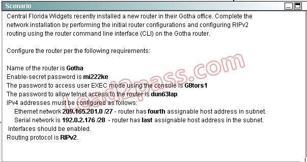 Gotha(config-if)#ip address 209.165.201.4 255.255.255.224 Gotha(config)#interface s0/0/0 Gotha(config-if)#ip address 192.0.2.190 255.255.255.240 Gotha(config-if)#no shutdown Gotha(config-if)#exit
