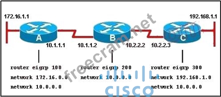 Explanation/Reference: Explanation: Here we required same autonomous system between router A,B,C.Routing updated always exchange between in same EIGRP EIGRP autonomous system.you can configure more than one EIGRP autonomous system on the same router. This is typically done at a redistribution point where two EIGRP autonomous systems are interconnected. Individual router interfaces should only be included within a single EIGRP autonomous system. Cisco does not recommend running multiple EIGRP autonomous systems on the same set of interfaces on the router. If multiple EIGRP autonomous systems are used with multiple points of mutual redistribution, it can cause discrepancies in the EIGRP topology table if correct filtering is not performed at the redistribution points. If possible, Cisco recommends you configure only one EIGRP autonomous system in any single autonomous system. http://www.cisco.com/en/US/tech/tk365/technologies_tech_note09186a0080093f07.shtml
