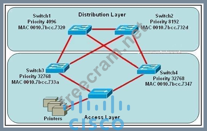 In this question, we only care about the Access Layer switches (Switch3 & 4). Switch 3 has a lower bridge ID than Switch 4 (because the MAC of Switch3 is smaller than that of Switch4) so both ports of Switch3 will be in forwarding state. The alternative port will surely belong to Switch4. Switch4 will need to block one of its ports to avoid a bridging loop between the two switches. But how does Switch4 select its blocked port?