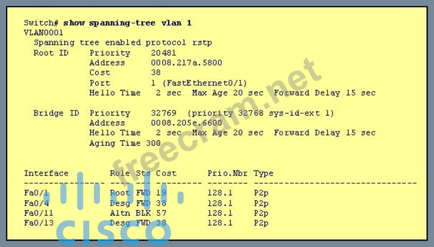 Explanation/Reference: Explanation: When a switch receives a BPDU, it first compares priority, the lower number wins. If a tie, compare MAC, the smaller one wins. Here Switch has 32769 priority which is greater than 20481 so switch will not elect for root bridge. It says the bridge priority for Switch is 32769, and the root priority is 20481. Which means that some other switch has the lower priority and won the election for VLAN 1.