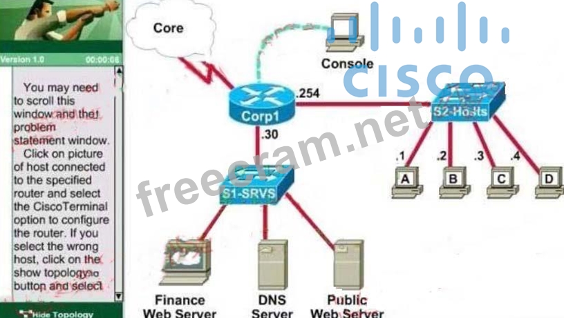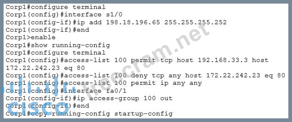 Corp1(config)# access-list 100 permit tcp host 192.168.33.3 host 172.22.242.23 eq 80 Comment: To deny any source to access finance server address (172. 22. 242. 23) {destination addr} on port number 80 (web) Corp1(config)# access-list 100 deny tcp any host 172.22.242.23 eq 80 Comment: