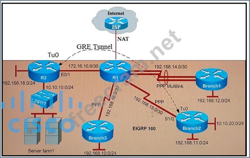 The GRE tunnel is configured between R2 and Branch2 routers, and traffic between Server farm1