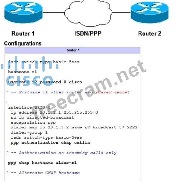 This is an example of a unidirectional authentication. In this setup, the ppp chap hostname alias-r1 command is configured on Router 1. Router 1 uses "alias-r1" as its hostname for CHAP authentication instead of "r1." The Router 2 dialer map name should match Router 1's ppp chap hostname; otherwise, two B channels are established, one for each direction.