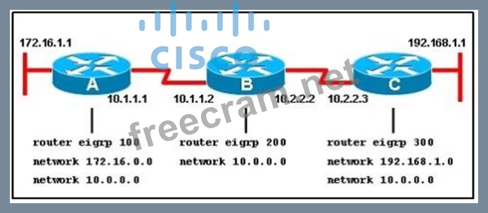 Explanation/Reference: Explanation: Here we required same autonomous system between router A,B,C.Routing updated always exchange between in same EIGRP EIGRP autonomous system. You can configure more than one EIGRP autonomous system on the same router. This is typically done at a redistribution point where two EIGRP autonomous systems are interconnected. Individual router interfaces should only be included within a single EIGRP autonomous system. Cisco does not recommend running multiple EIGRP autonomous systems on the same set of interfaces on the router. If multiple EIGRP autonomous systems are used with multiple points of mutual redistribution, it can cause discrepancies in the EIGRP topology table if correct filtering is not performed at the redistribution points. If possible, Cisco recommends you configure only one EIGRP autonomous system in any single autonomous system. Reference: http://www.cisco.com/en/US/tech/tk365/technologies_tech_note09186a0080093f07.shtml