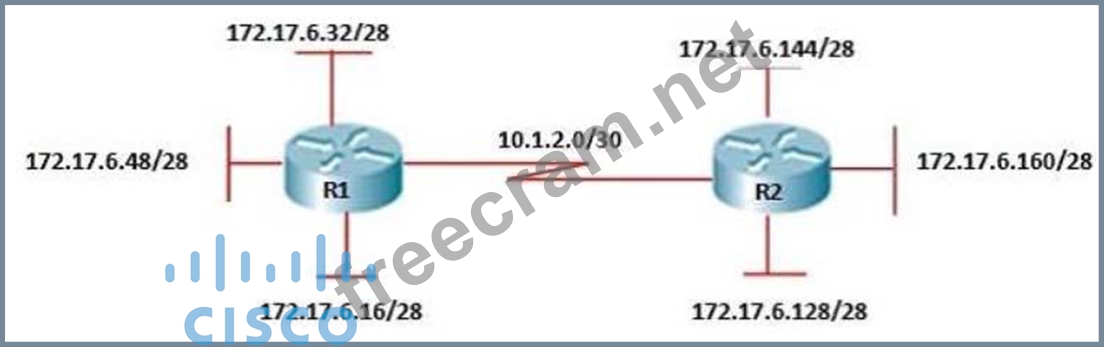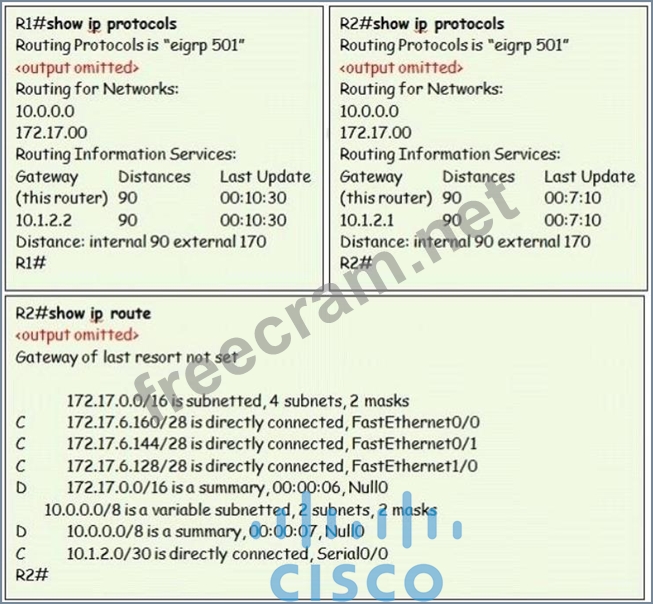 Explanation/Reference: Explanation: If you look carefully at the R2 ip route, you will discover that the R2 does not learn any network from R1; this is because the routing protocol used here (EIGRP) performs auto summary when advertising routes to peers across a network. So in this case the address 172.17.0.0/26 is a summarized address. If the router was configured with no auto summary command, R2 LAN addresses would have been advertised and reached. Reference: http://www.orbitco-ccna-pastquestions.com/CCNA---EIGRP-Common-Question.php