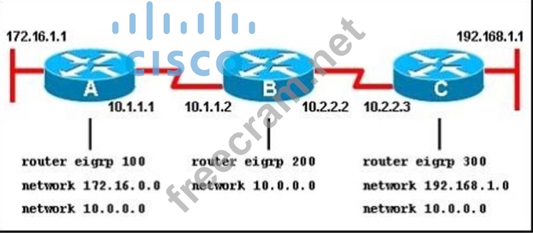 Explanation/Reference: Explanation: Here we required same autonomous system between router A,B,C.Routing updated always exchange between in same EIGRP EIGRP autonomous system. You can configure more than one EIGRP autonomous system on the same router. This is typically done at a redistribution point where two EIGRP autonomous systems are interconnected. Individual router interfaces should only be included within a single EIGRP autonomous system. Cisco does not recommend running multiple EIGRP autonomous systems on the same set of interfaces on the router. If multiple EIGRP autonomous systems are used with multiple points of mutual redistribution, it can cause discrepancies in the EIGRP topology table if correct filtering is not performed at the redistribution points. If possible, Cisco recommends you configure only one EIGRP autonomous system in any single autonomous system. Reference: http://www.cisco.com/en/US/tech/tk365/technologies_tech_note09186a0080093f07.shtml