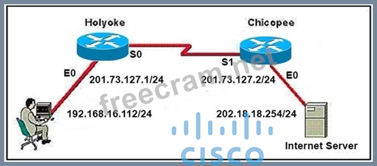 Refer to the graphic. Users on the Holyoke router are unable to access the intranet server attached to interface E0 of the Chicopee router. Inspection of the routing table of the Holyoke router shows that an entry for the Chicopee E0 network is missing.