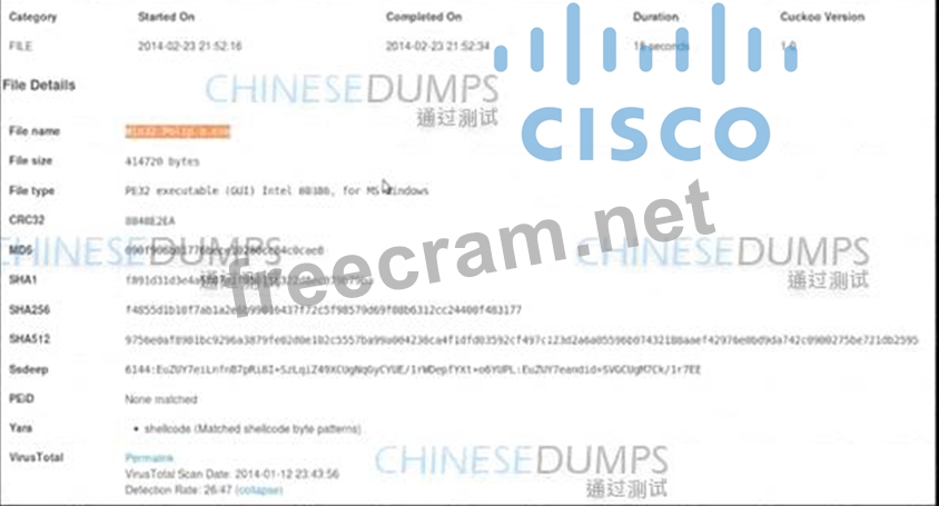 The Cuckoo report indicates that the file is a PE32 executable for MS Windows, which is typically an executable file format. The presence of the watermark "CHINESEDUMPS" and the detection ratio from VirusTotal suggest that the file is recognized by multiple antivirus engines as potentially harmful. This aligns with option A, suggesting that the file, named Win32.polip.a.exe, should be considered malicious and flagged accordingly. References: The information provided is based on standard practices for analyzing potentially malicious files using tools like Cuckoo and services like VirusTotal, which are commonly referenced in cybersecurity documentation, including Cisco's cybersecurity training materials.