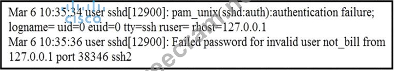 The /var/log/auth.log file contains information about authentication and authorization events on a Linux system, such as successful and failed logins, sudo commands, and SSH sessions. The output in the exhibit shows a failed login attempt from a user named "root" using SSH. References: https://www.cisco.com/c/en/us /td/docs/security/ise/2-4/admin_guide/b_ise_admin_guide_24/b_ise_admin_guide_24_new_chapter_01101. html