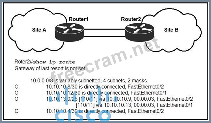 Refer to the exhibit. If OSPF is running on this network,how does Router 2handle traffic from Site B to 10.10.13/25 at Site A?