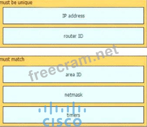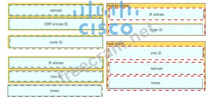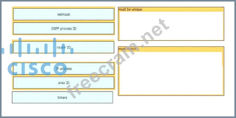 A network engineer is configuring an OSPFv2 neighbor adjacency Drag and drop the parameters from the left onto their required categories on the right. Not all parameters are used