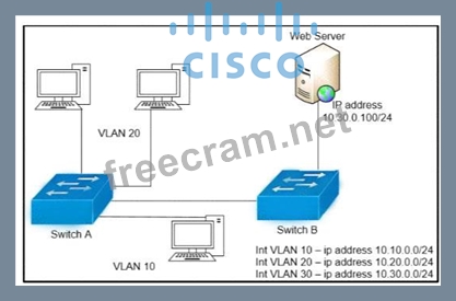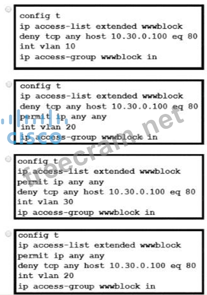 A network engineer must block access for all computers on VLAN 20 to the web server via HTTP All other computers must be able to access the web server Which configuration when applied to switch A accomplishes this task?