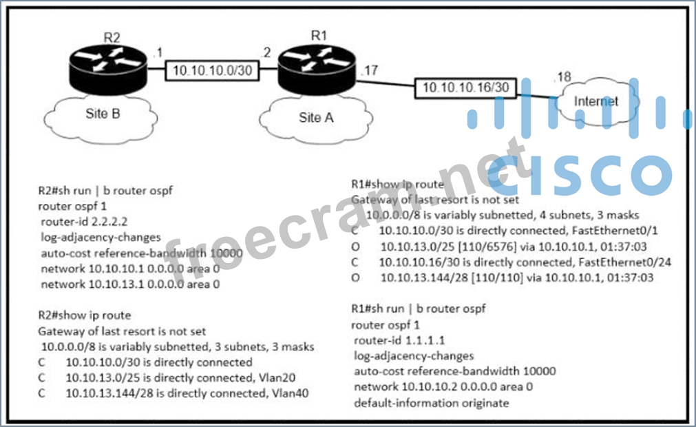 The default-information originate command is configured under the R1 OSPF configuration After testing workstations on VLAN 20 at Site B cannot reach a DNS server on the Internet Which action corrects the configuration issue?