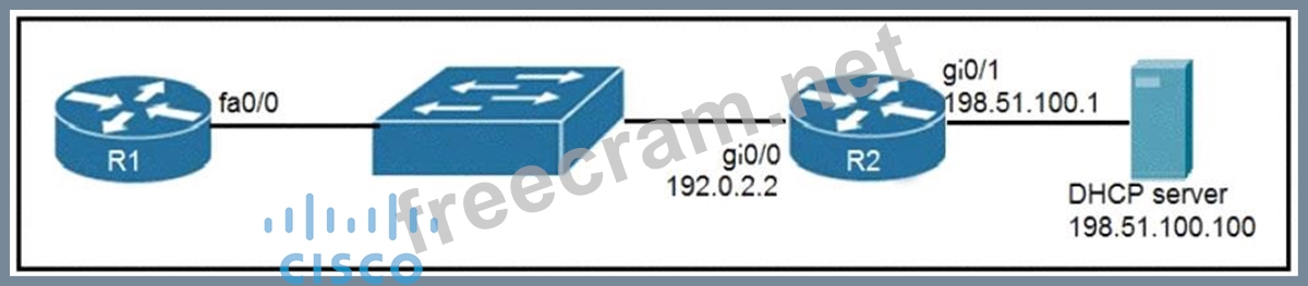An engineer deploys a topology in which R1 obtains its IP configuration from DHCP. If the switch and DHCP server configurations are complete and correct. Which two sets of commands must be configured on R1 and R2 to complete the task? (Choose two)
