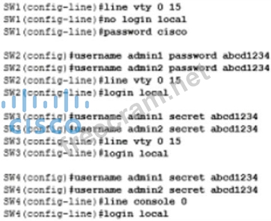 An administrator configures four switches for local authentication using passwords that are stored in a cryptographic hash. The four switches must also support SSH access for administrators to manage the network infrastructure. Which switch is configured correctly to meet these requirements?