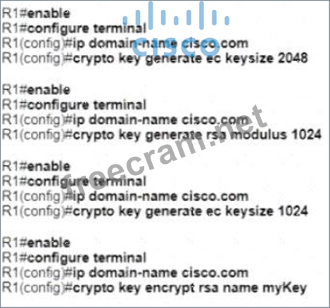 A network administrator must to configure SSH for remote access to router R1 The requirement is to use a public and private key pair to encrypt management traffic to and from the connecting client.