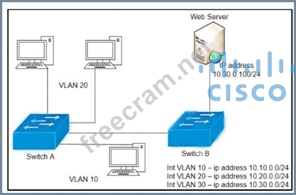 A network engineer must block access for all computers on VLAN 20 to the web server via HTTP All other computers must be able to access the web server Which configuration when applied to switch A accomplishes this task?