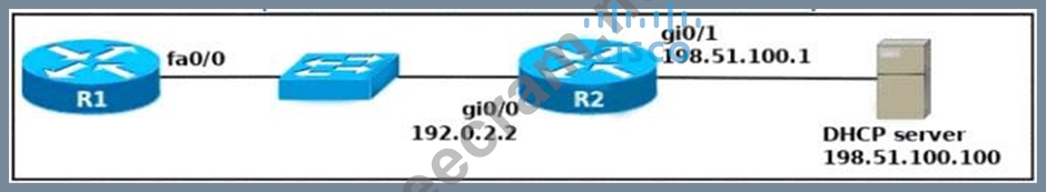 An engineer deploys a topology in which R1 obtains its IP configuration from DHCP. If the switch and DHCP server configurations are complete and correct. Which two sets of commands must be configured on R1 and R2 to complete the task? (Choose two)