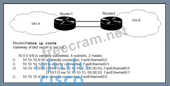 If OSPF Is running on this network, how does Router2 handle traffic from Site B to 10.10.13.128/25 at Site A?