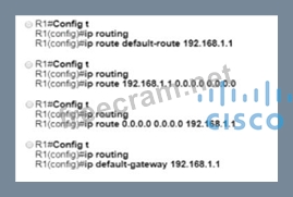 Router R1 must send all traffic without a matching routing-table entry to 192.168.1.1. Which configuration accomplishes this task?