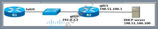 An engineer deploys a topology in which R1 obtains its IP configuration from DHCP. If the switch and DHCP server configurations are complete and correct. Which two sets of commands must be configured on R1 and R2 to complete the task? (Choose two)