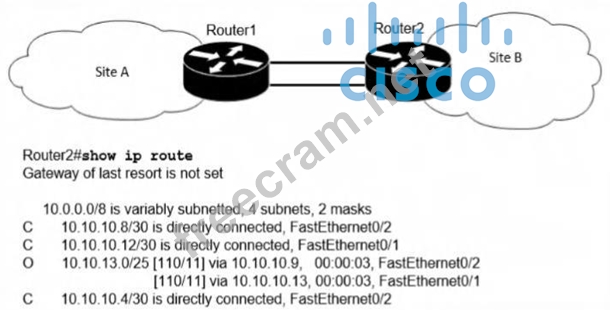 If OSPF Is running on this network, how does Router2 handle traffic from Site B to 10.10.13.128/25 at Site A?
